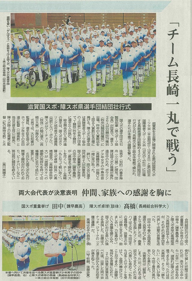 滋賀国スポ・障スポ県選手団結団壮行式(本学(附属含む)より6名出場)◆長崎新聞