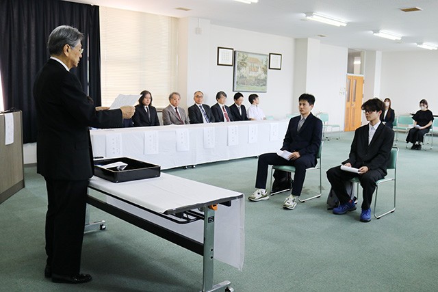 本年度後期は、3名の学生が大学院工学研究科修士課程へ入学しました。式では、黒川不二雄学長が入学許可を読み上げ、学長からは「研究は社会の発展に貢献する重要な営みであり、自ら課題を見つけて取り組む姿勢が求められる」といった研究の意義についてのお話もあり、学生たちは真剣な面持ちで耳を傾け、今後の研究活動に向けて、決意を新たにしている様子でした。
