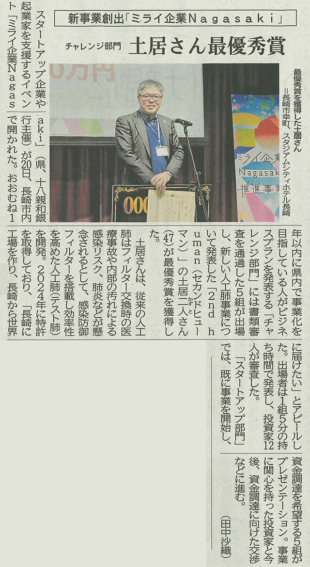 2月20日(金)、スタートアップ企業や起業家を支援する推進事業「ミライ企業Nagasaki」が、長崎県および十八親和銀行の主催により開催されました。本事業の「チャレンジ部門」(今後事業化を予定している分野)において、工学部工学科医療工学コースの土居二人講師が最優秀賞を受賞しました。