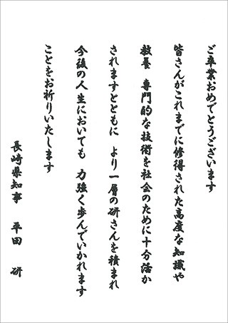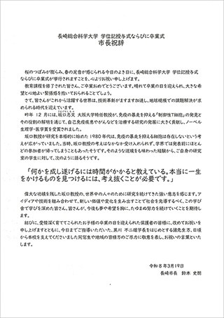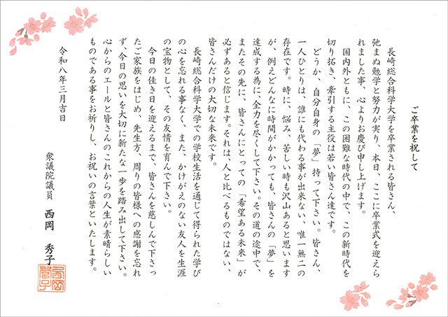 厳しい冬の寒さも過ぎ、柔らかな日差しが感じられる春となりました。本日ここにご卒業を迎えられました皆様、ならびに、ご家族の皆様、ご卒業おめでとうございます。全文はこちら
