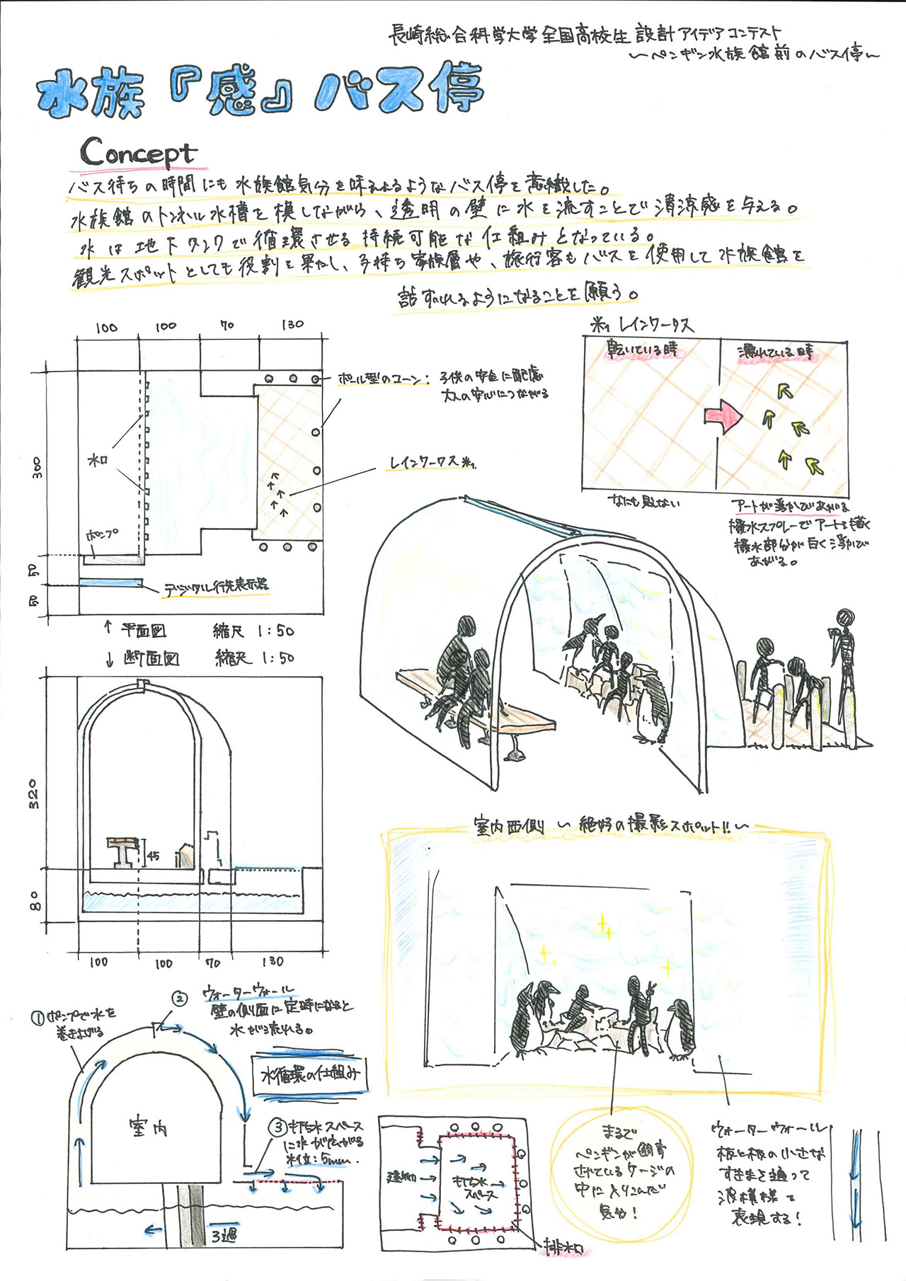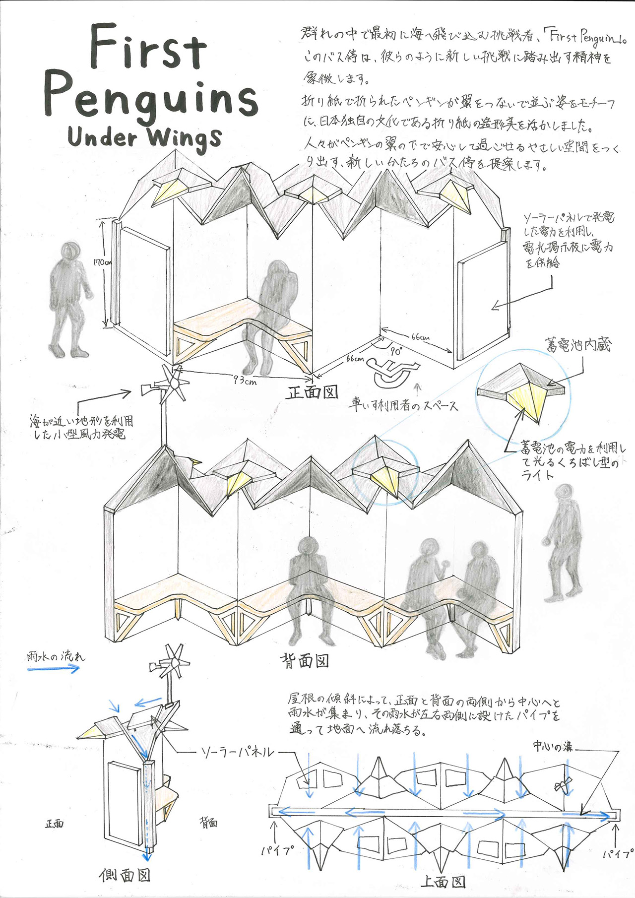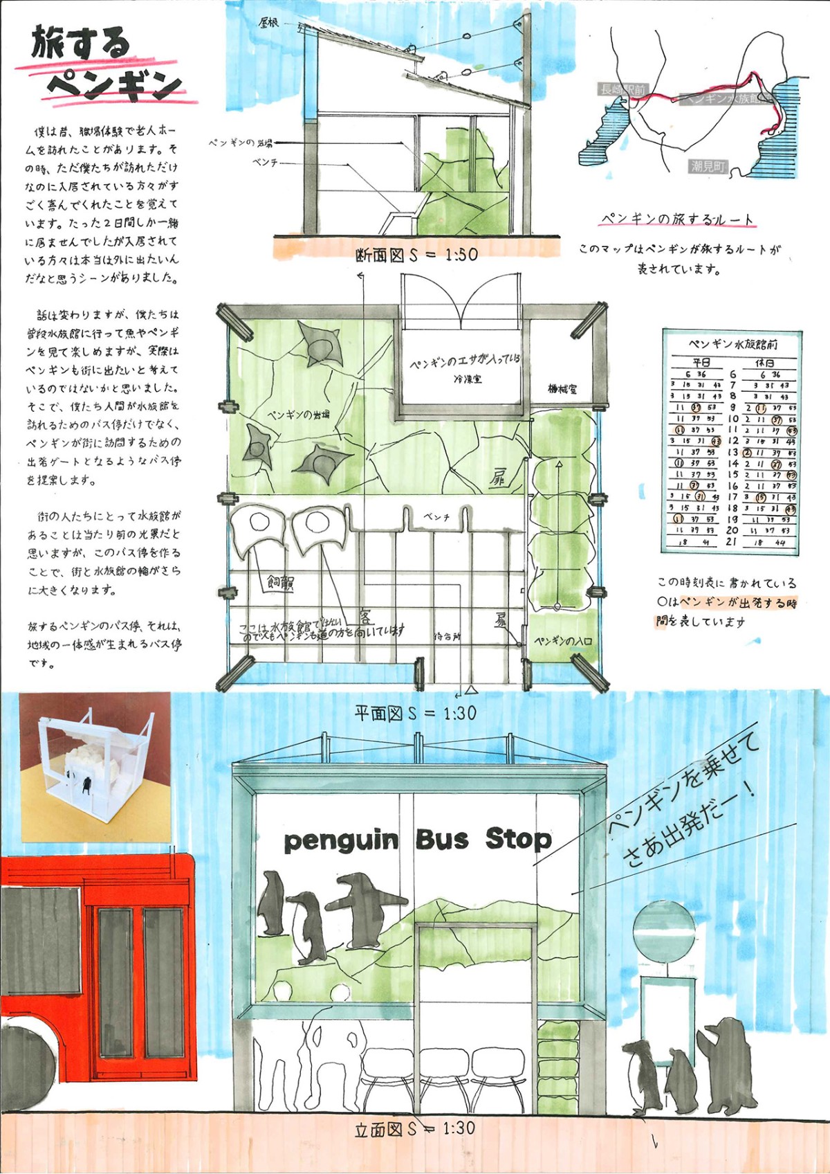 水族館の人気者であるペンギンを「旅する仲間」としてバス停に招き込んだ発想がとても魅力的です。立面や平面だけでなく、ペンギンの動きや来館者の過ごし方まで丁寧に描かれており、待ち時間そのものを楽しい体験に変えている点を高く評価しました。