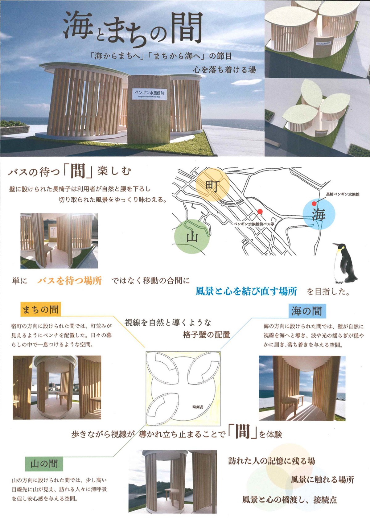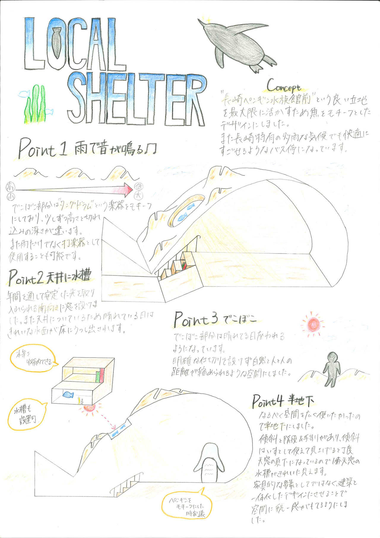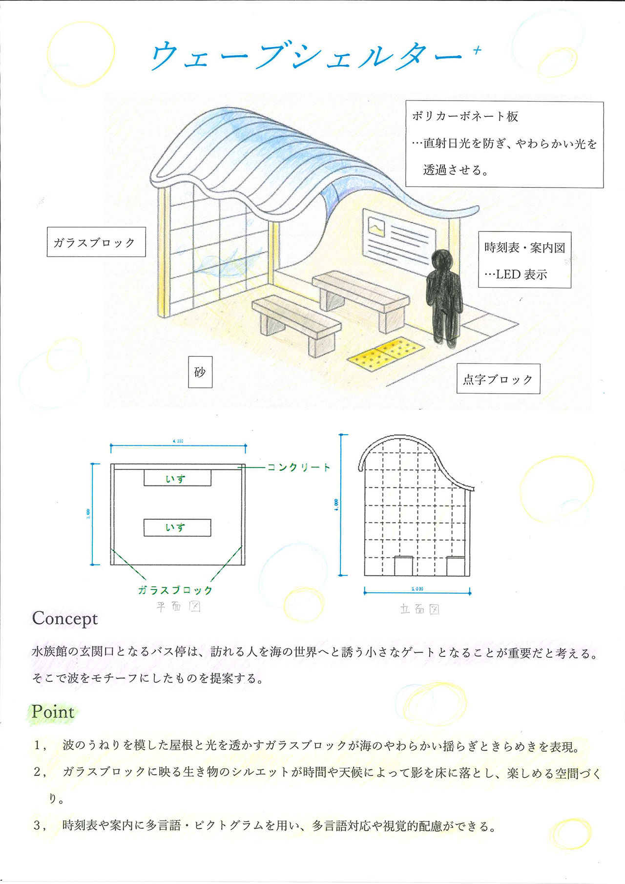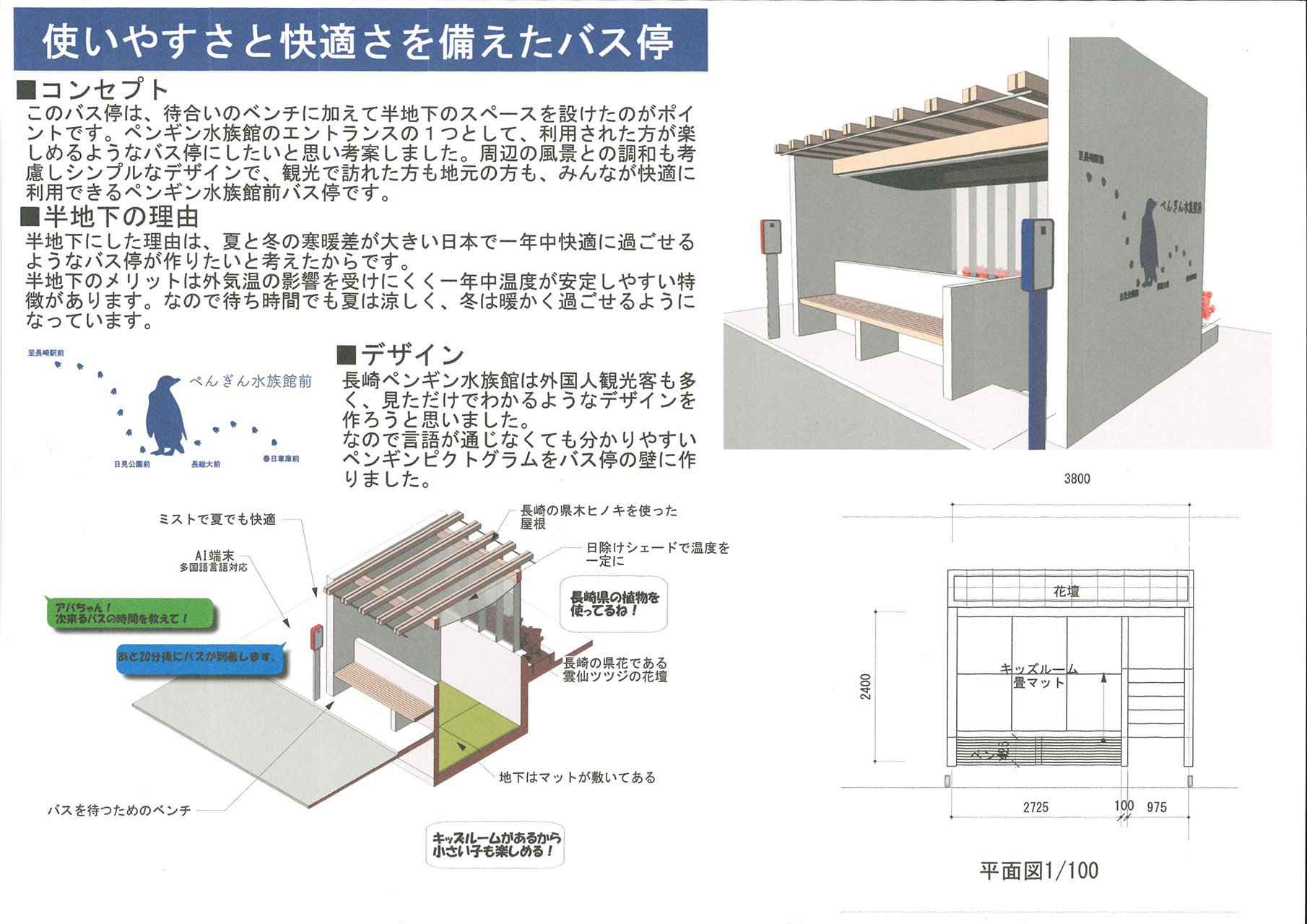 水族館の人気者であるペンギンを「旅する仲間」としてバス停に招き込んだ発想がとても魅力的です。立面や平面だけでなく、ペンギンの動きや来館者の過ごし方まで丁寧に描かれており、待ち時間そのものを楽しい体験に変えている点を高く評価しました。