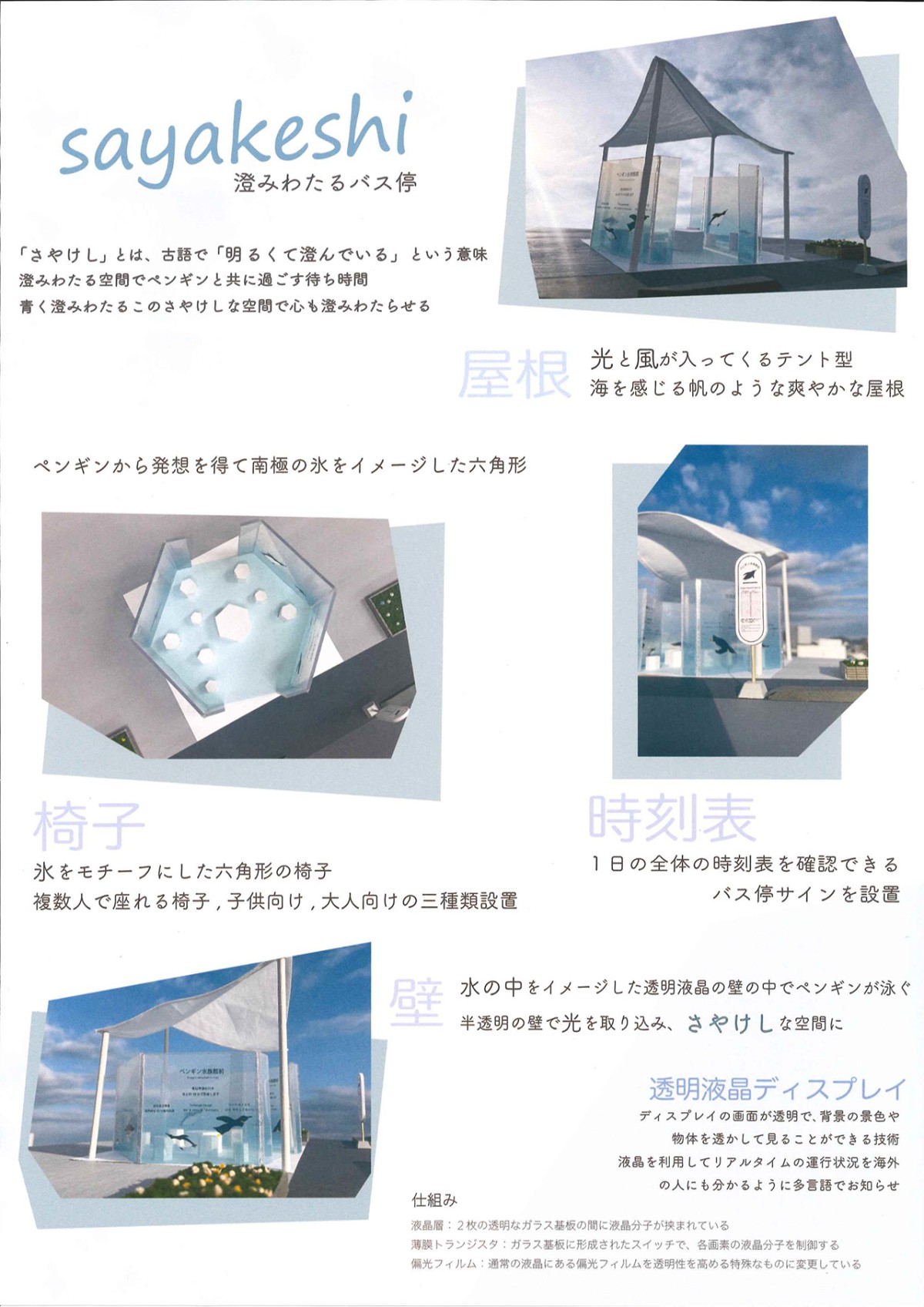 ソーラーパネルや風力、小さな雨水利用の仕組みをさりげなく組み込み、未来の環境共生型バス停の姿を具体的な形として提案している点を評価しました。