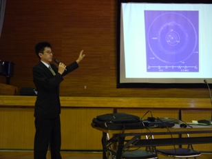 授業は1年生約300名が参加。松川准教授は「はやぶさとは何か」と話し、探査機の目的と役割、太陽系の起源解明、小惑星イトカワ、サンプルリターン、JAXA宇宙航空研究開発機構、などの項目に分けて、映像を用いながら詳しく説明した。