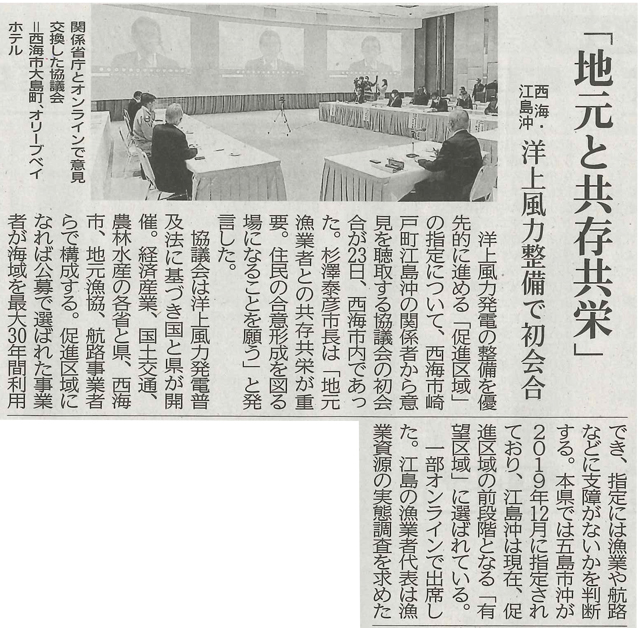 脱炭素社会の実現に向けて洋上風力発電を西海市江島沖の海域に整備しようと、国や地元自治体それに地元の漁協などでつくる協議会の初会合が開かれ、会合に長崎総合科学大学 池上国広学長も出席。