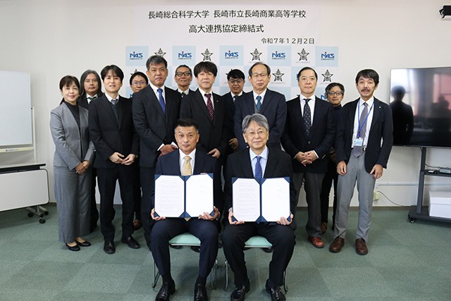 2025年12月2日、本学と長崎商業高等学校は、教育活動及び指導内容の相互理解を深めるため、情報交換及び交流を行い、高校生の視野を広げ、進路に対する意識や学習意欲を高めるとともに、大学の教育研究内容への理解を深め、もって高校教育・大学教育の接続と連携を図り、地域社会の発展と科学技術人材育成に寄与することを目的として、連携協定を締結しました。
