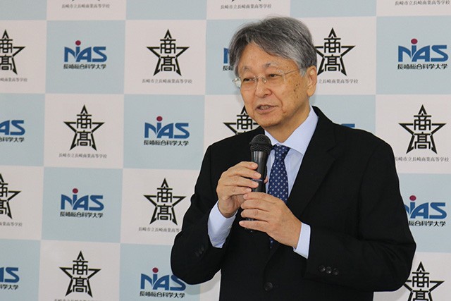 本学は理工系大学ではありますが、これまでにも商業高校出身の学生が入学し、幅広い分野で学びを積み重ねてきました。 理系・工業系のイメージが強い本学と、商業教育の伝統を持つ長崎商業高校が互いの強みを生かしながら関係を深めていくことは、長崎の産業発展、地域の未来づくりにも大きく寄与するものと確信しております。