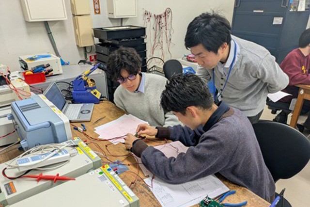 本学とイサハヤ電子株式会社との包括連携協定に基づき、2025年11月11日および18日に、清山浩司教授ならびに電気電子工学コースの学生が同社を訪問し、実践的な教育カリキュラムを実施しました。イサハヤ電子株式会社の現場で行われた今回の教育カリキュラムでは、現場の第一線で活躍する技術者から直接指導を受けることにより、学内での講義では得難い知識や視点を習得し、将来の進路に対する意識を高める貴重な機会となりました。
