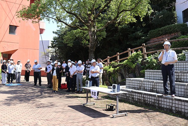 9月30日(火)、学生・教職員が迅速かつ的確に避難できる体制を整えることを目的に、防災・減災意識の向上を図るための防災訓練を実施しました。今回は、橘湾を震源とする地震が発生し、長崎市で震度5強を観測したという想定で行われ、キャンパス内でも強い揺れを感じた状況を再現しました。また、地震により本館厨房で火災が発生したとの設定で、通報・消火・避難・救出を組み合わせた総合的な訓練として実施しました。参加者からは、「日頃の行動を振り返る良い機会になった」「実際に体験することで避難経路の重要性を再認識した」といった声が聞かれ、防災意識を高める貴重な時間となりました。