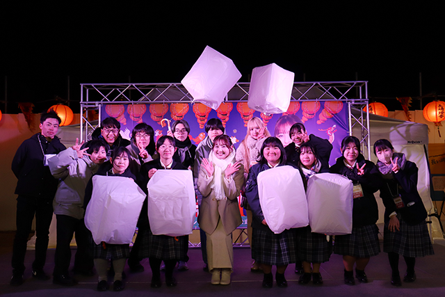当日は、観光アプリ「ストローカル」を運営する株式会社ゼンリンを中心に、本学、諫早商業高等学校、株式会社十八親和銀行、株式会社三菱UFJ銀行が連携し、ボランティアスタッフとして運営を支援しました。強い風が吹く寒空の下にもかかわらず、600名を超える来場者が訪れ、会場は大いににぎわいました。ランタンの温かな灯りが夜空に美しく映え、参加した学生にとっても地域の皆さまと交流を深める貴重な機会となりました。
