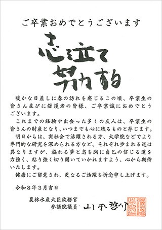 厳しい冬の寒さも過ぎ、柔らかな日差しが感じられる春となりました。本日ここにご卒業を迎えられました皆様、ならびに、ご家族の皆様、ご卒業おめでとうございます。全文はこちら